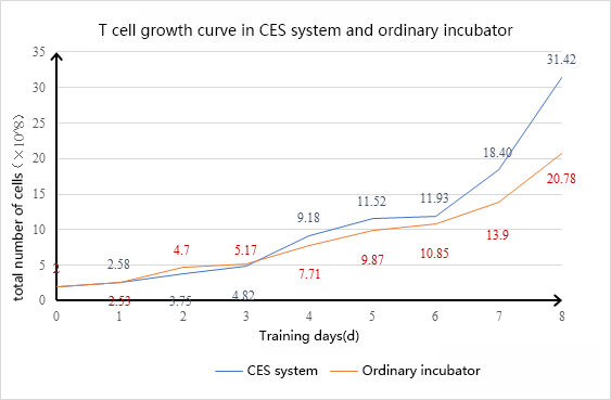 The cell growth curve obtained by CES cell expansion system and ordinary incubator culture T cells is shown in the figure below: