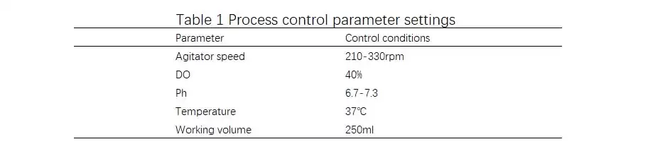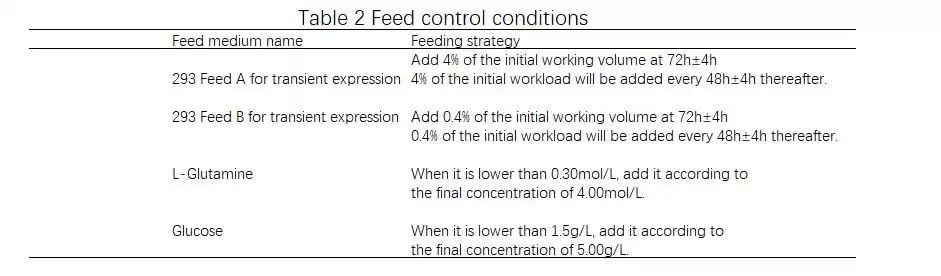 In this experiment, a cell density of 5×105 cells/mL was used to inoculate, and air and oxygen were cascaded into DO, CO2 and 0.5 mol/L NaOH solution cascade pH. See Table 1 and Table 2 for other parameter control and feeding control. In addition, on the eighth day, an additional 10 mL of feed A for transient expression of 293 and 1 mL of feed B for transient expression of 293 were added based on the actual conditions of the cells.