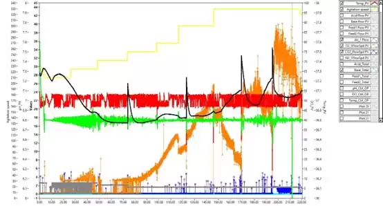 Figure 3 293T cell culture cycle parameter control trend chart: red – temperature; black – pH; green – DO; yellow – rotation speed (rpm); blue – CO2 flow rate (mL/min); gray – air flow rate (mL/min) ; Orange – Oxygen flow rate (mL/min).