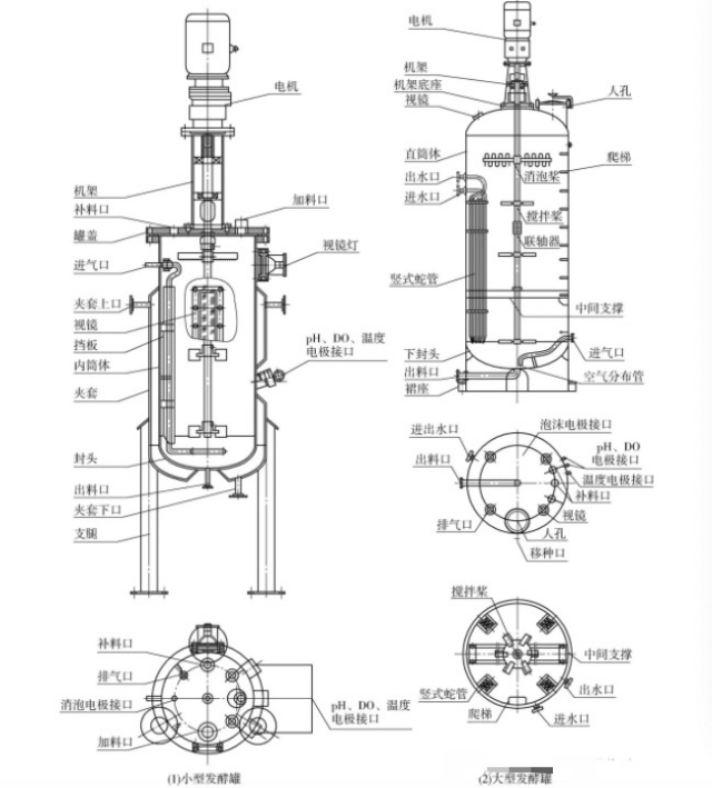 The main structure of the fermenter includes: tank, agitator, baffle, air distribution device, mechanical seal, heat exchanger, sensor interface, accessory structure, etc., as shown in the figure.