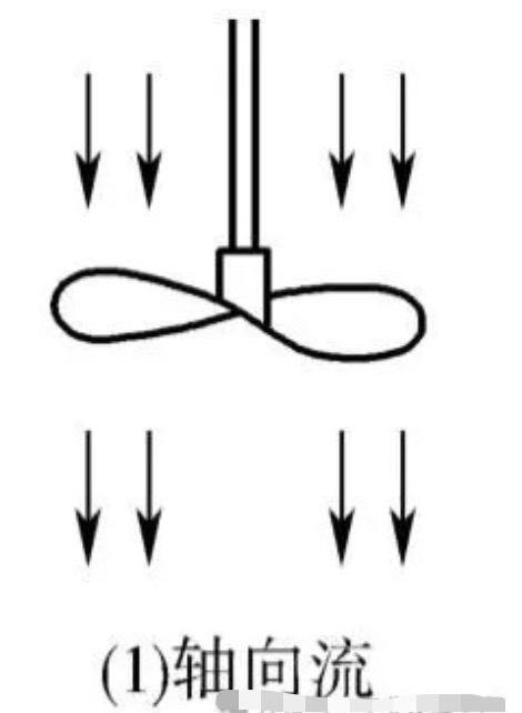Axial flow is the direction of fluid flow parallel to the mixing axis, the fluid is driven by the paddles, so that the fluid flows downward, meet the bottom of the container and then turned up, forming an up and down circulation flow, the liquid circulation flow rate is large, as shown in Figure (1).