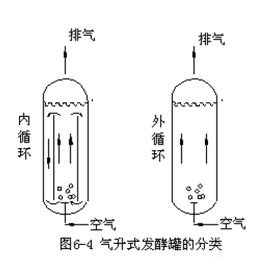 Air-lift fermenters can be divided into internal circulation air-lift fermenters and external circulation air-lift fermenters according to the different liquid circulation methods they adopt. The former makes the ascending pipe and the descending pipe in the circulation process both arranged inside the same fermenter; while the latter makes the ascending pipe and the descending pipe arranged separately. (as shown in Figure 6-4)