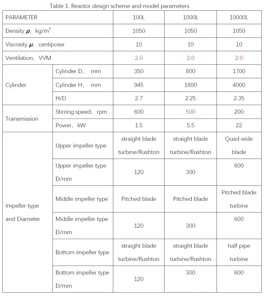 There are three types of simulated production-scale fermentation tanks, with nominal volumes of 100L, 1000L and 10000L. The 100L and 1000L fermentation tanks use a combination of straight blade disc turbine + inclined blade propeller + straight blade disc turbine stirring impeller, and the heat exchange method is jacketed. The 10000L mixing system uses a half-tube disc turbine stirring impeller with strong gas dispersion ability in the bottom layer, a tilted blade disc turbine stirring impeller in the second layer, and a four-wide blade axial flow type stirring impeller with good mixing performance in the upper layer. The heat exchange method It is a built-in tube. In order to meet the high oxygen consumption demand, the stirring motor powers used in the three fermentation tanks are 1.5kW, 5.5kW and 22kW respectively, and the maximum stirring speeds are 600rpm, 500rpm and 200rpm respectively. The main design scheme and model parameters of the reactor are shown in Table 1.