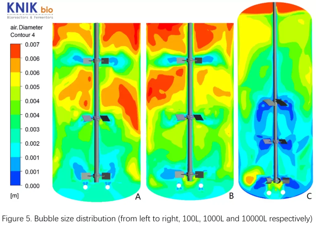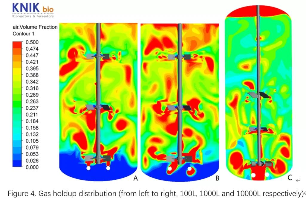 From the perspective of gas holdup distribution (see Figure 4), under this design scheme, the bottom gas flow is completely controlled, the gas is well dispersed, and there is almost no oxygen supply dead zone at the bottom of the reactor. The gas distribution in the entire reactor is very uniform, and the gas content rate is high. The three reactors have good gas dispersion and oxygen mass transfer capabilities.