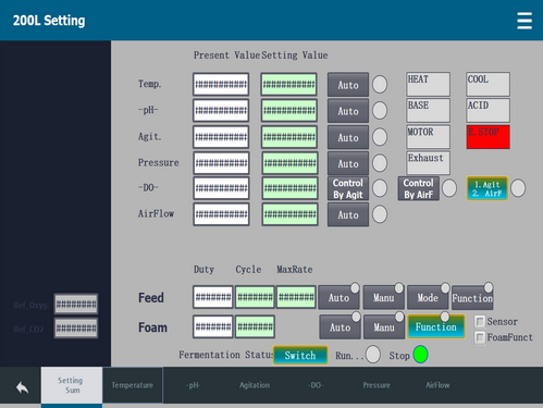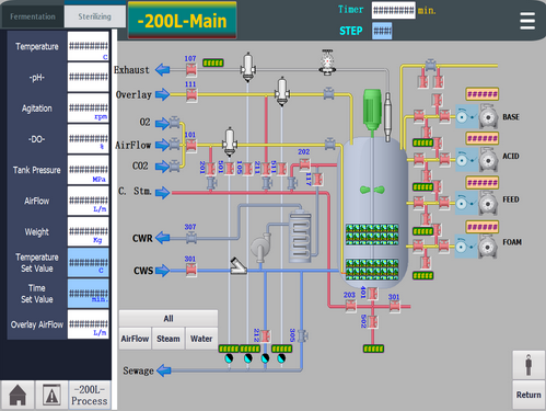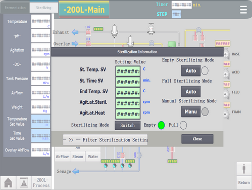 | 14.7 | Sterilization | Automatically controlled sterilization of solid and empty cans, including air inlet filters and exhaust filters. It can control the sterilization temperature, sterilization time, tank pressure, jacket pressure and stirring speed. After sterilization, it will automatically enter the fermentation preparation state. |