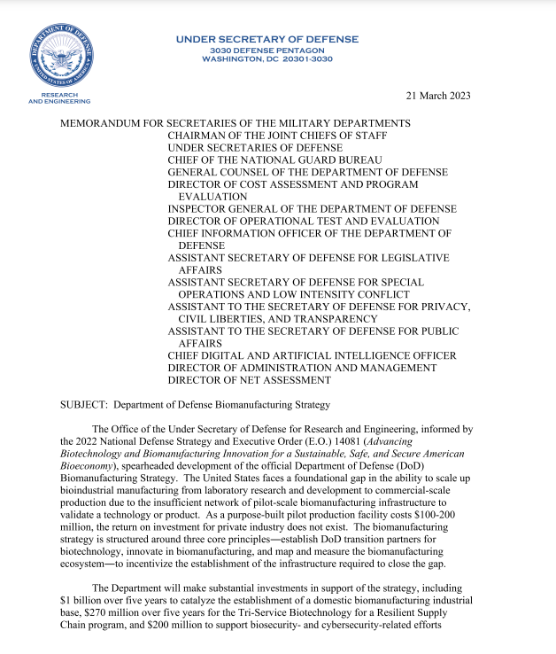 “The Department of Defense recognizes that biotechnology is a critical technology area that will transform the way the Department of Defense develops new capabilities, executes missions, and adapts to major global changes,” Heidi Shyu, undersecretary of defense for research and engineering, said at the time. The executive order will advance and synchronize Department of Defense and Federal Government programs to strategically leverage biotechnology to maintain our Nation’s economic, military, and technological advantages.”